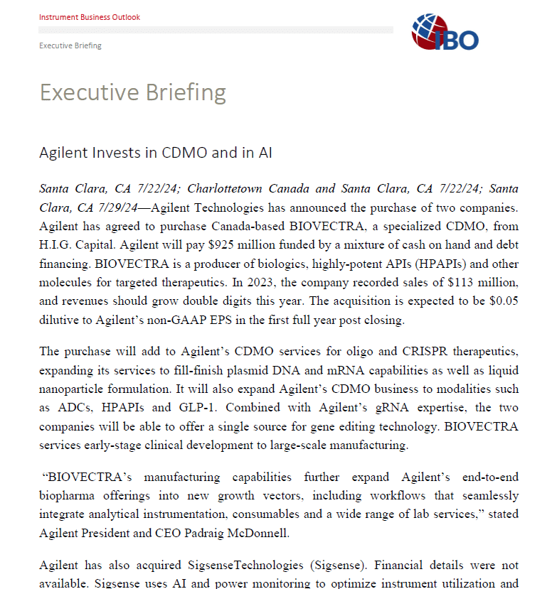 IBO (Instrument Business Outlook) is a twice-monthly newsletter aimed at providing decision-makers with the latest and most complete information available on the life science and analytical instrument industry, and lab product markets. IBO delivers the latest curated industry news, information and trends, as well as SDi data and analysis to deliver the maximum in industry insight with a minimum time investment for executives and investors.