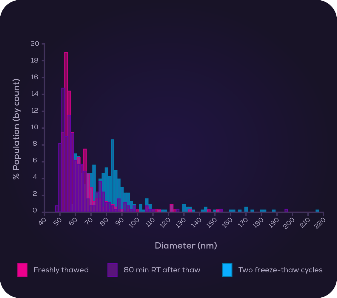Figure 5. Particle size distributions are shown for lipid nanoparticle samples analysed immediately after thawing, after thawing and holding at room temperature for 80 min, or following two freeze–thaw cycles. Analysis was performed using a Pulsoid Beta instrument and Beta software.