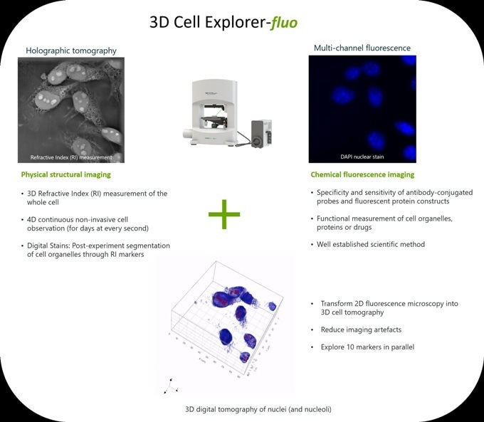 One year after launching its unique 3D Cell Explorer (the first microscope able to look inside living cells without harming them, in 3D and real time), the EPFL spin-off reaches a new fundamental milestone for cell biology and microscopy and releases its latest pioneering product: the 3D Cell Explorer-fluo.